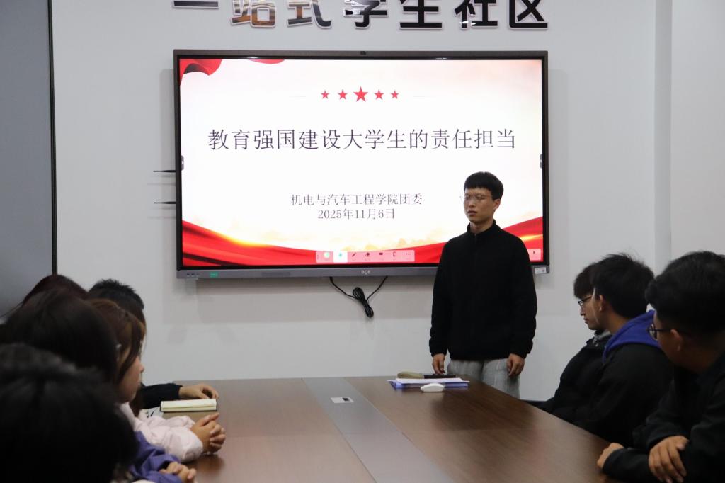 2025年11月6日,天水师范大学机电与汽车工程学院在“一站式”学生社区成功举办朋辈思政共学课堂。本次活动聚焦“教育强国责任担当”“学科竞赛能力提升”“就业创业持续发展”三大核心主题,由张生海、马浩浩、张丽改三位老师带来精彩分享,为同学们在思想引领、竞赛实践与职业发展等方面提供系统指导,助力大家明确目标、拓展视野、提升综合素养。活动吸引了各班团支书、学科竞赛与创新创业爱好者等40余名同学踊跃参与,现场交流热烈,同学们均感受益匪浅。