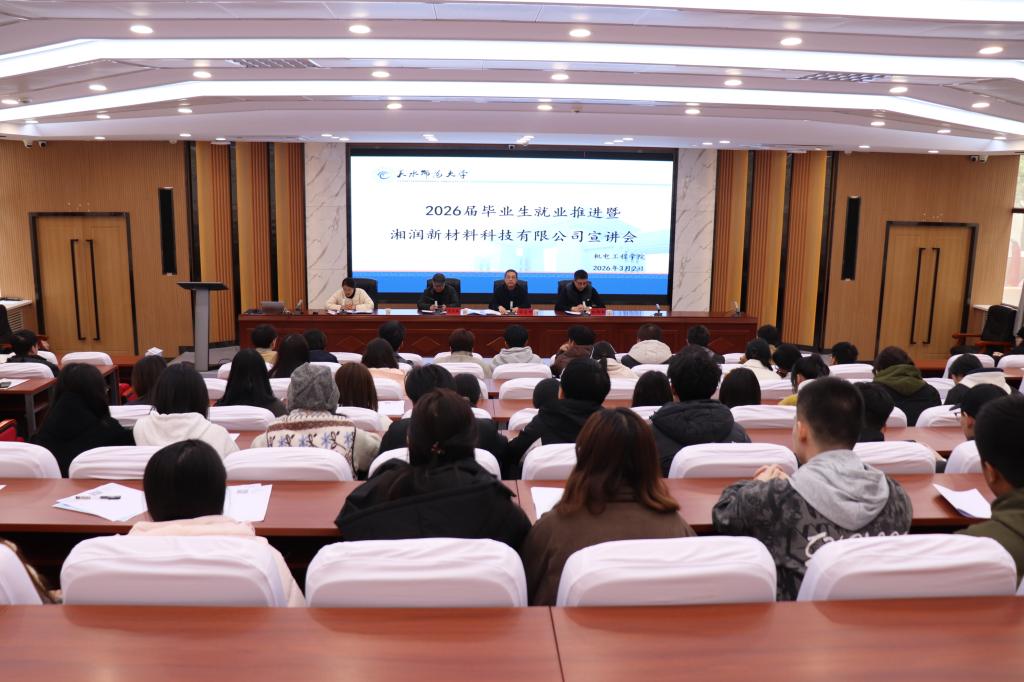 为抢抓就业先机,在新学年伊始就将就业工作摆在突出位置,3月2日,天水师范大学机电工程学院隆重举行2026届毕业生就业推进会暨湘润新材料科技有限公司专场宣讲会。学院党委书记、党委副书记、企业代表及近150名毕业生与会,共同拉开了新学年就业攻坚的序幕。会议由毕业班辅导员张丽改主持。