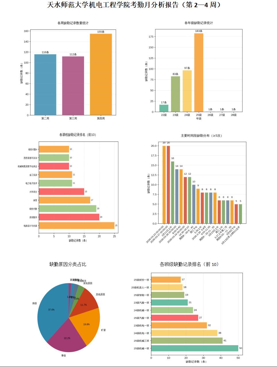 5.特定时间段管理薄弱:周三上午、周五下午等时间段缺勤集中,需针对性管理